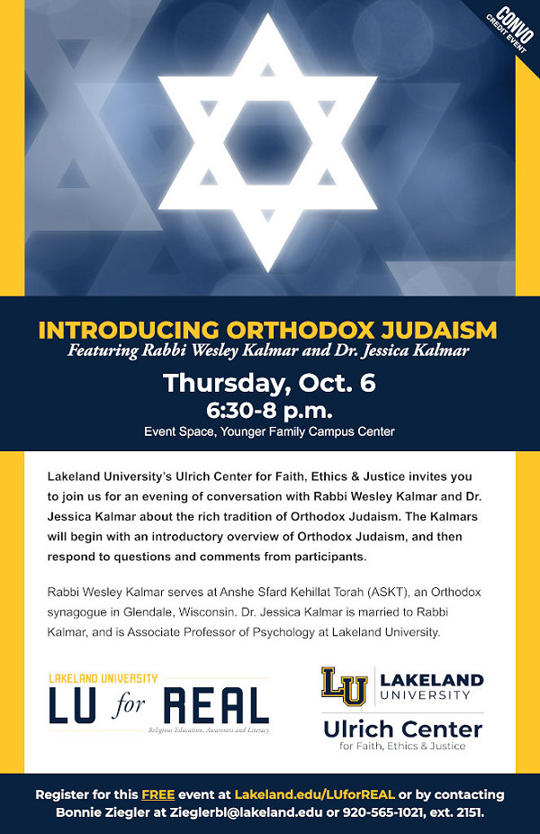 This LUforREAL event will focus on the traditions of Orthodox Judaism. Rabbi Wesley Kalmar serves at Anshe Sfard Kehillat Torah (ASKT), an Orthodox synagogue in Glendale, Wis. Jessica Kalmar, Ph.D., is married to Rabbi Kalmar, and is associate professor of psychology at Lakeland. The Kalmars have presented at Ulrich Center events in the past. A question and answer session will follow their presentation. The Kalmars will help others become more aware of religious diversity and expression and help others gain respect for a different faith.